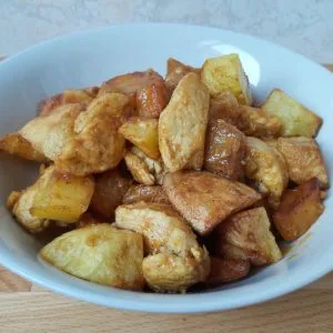 3. Amíg sül a krumpli, kockázd fel a csirkemellet, ugyanakkora méretűre, mint a krumplit.