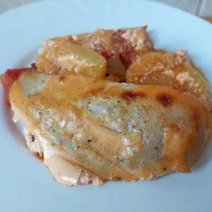 13. Tedd az elősütött csirkemelleket a krumpli tetejére.